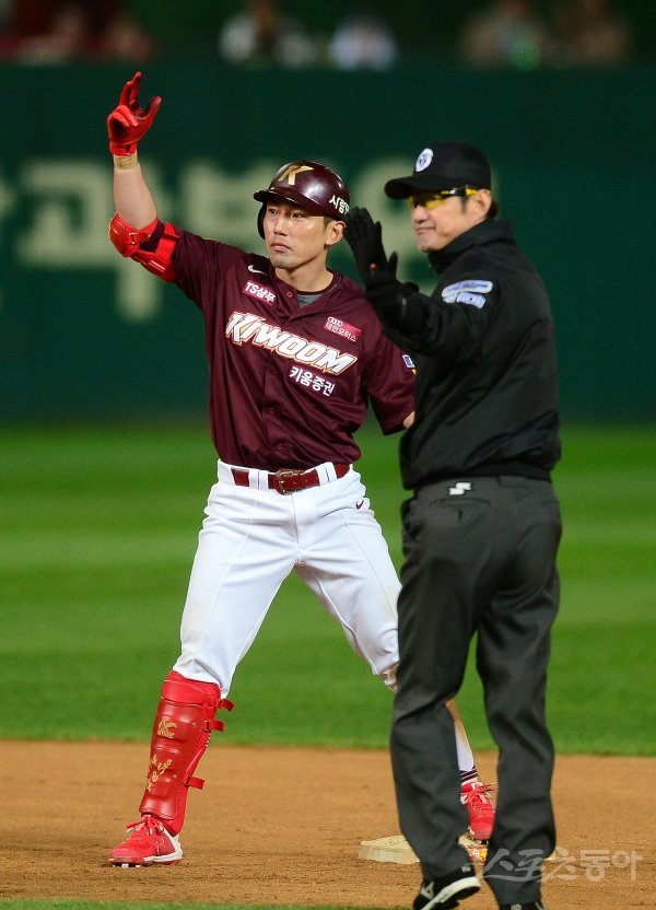 연장 11회초 1사 키움 서건창이 우전 2루타를 치고 2루에서 기뻐하고 있다.