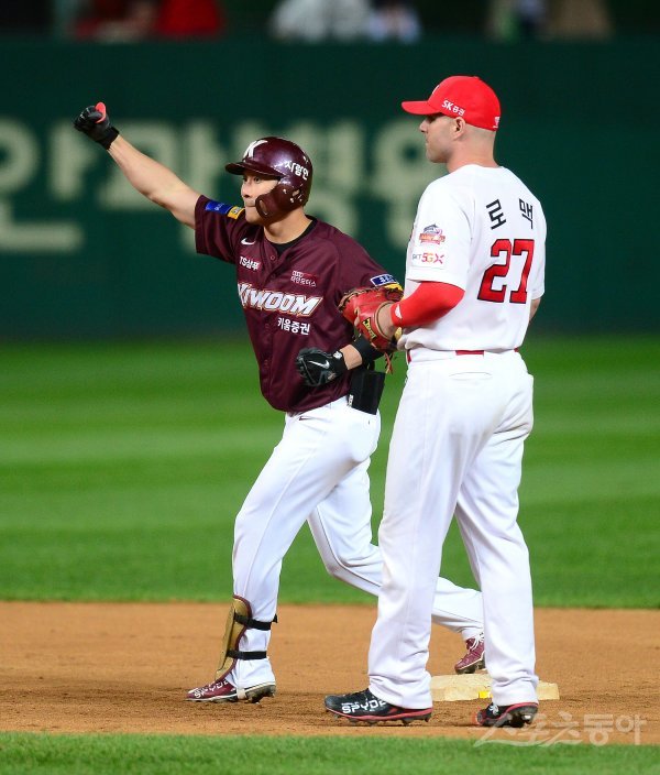 연장 11회초 1사 2루 키움 김하성이 1타점 중전 2루타를 치고 2루에서 환호하고 있다.