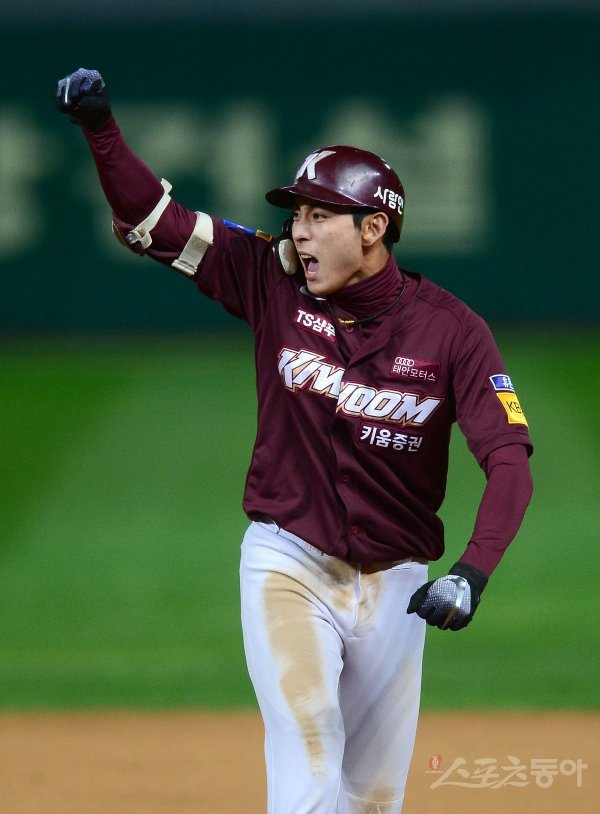 연장 11회초 1사 2루 키움 이정후가 1타점 좌전 안타를 치고 1루에서 환호하고 있다.
