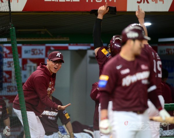 연장 11회초 1사 2루 키움 장정석 감독이 이정후의 1타점 좌전 안타 때 득점한 김하성과 기뻐하고 있다.