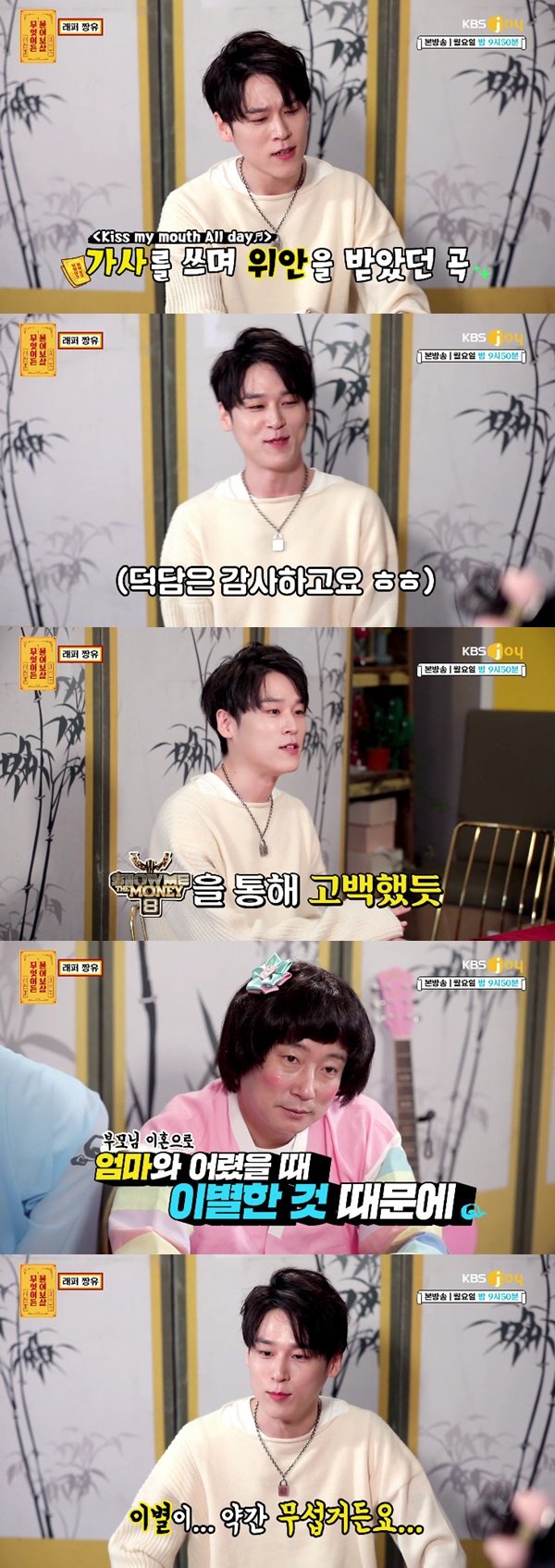 짱유는 "엄마와 어렸을 때 헤어진 기억 때문인디 이별이 무섭다. 엄마와는 5~6살 때 헤어졌고 마지막으로 본 건 초등학교 1학년 때다. 이후로는 친척들 집을 옮겨가며 생활했다"고 털어놨다.