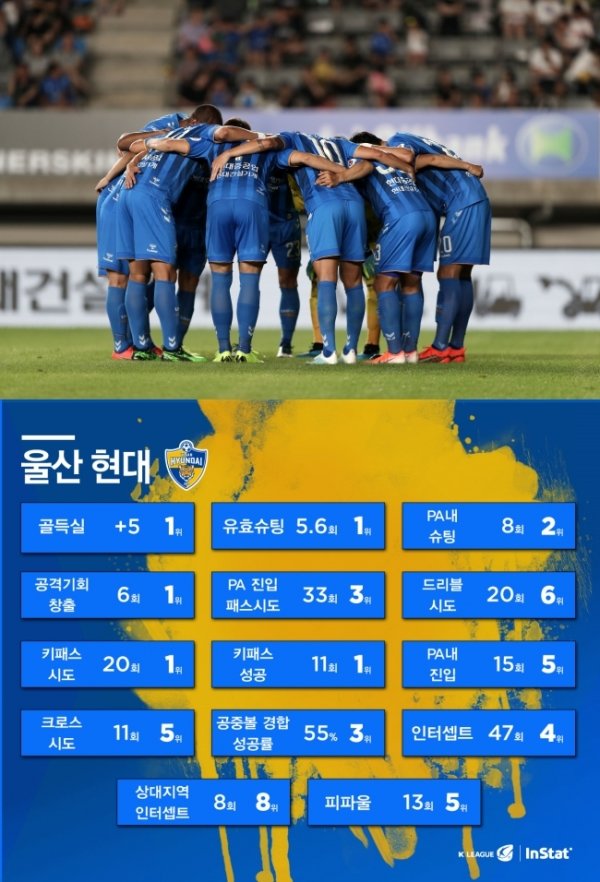울산은 9월에 치른 5경기에서 경기당 ▲유효슈팅 5.6회 ▲공격기회 창출 6회 ▲키 패스 시도 20회 중 11회 성공과 같은 항목에서 1위를 차지해 득점이 기대되는 장면을 가장 많이 만들어 냈다. 그 밖에도 경기당 ▲페널티 에어리어 내 슈팅 8회 및 패스 시도 33회 ▲공중 볼 경합 성공률 55% ▲인터셉트 47회 ▲크로스 시도 11회로 경기에 박진감을 실어주는 부문에서도 상위권에 머물렀다.