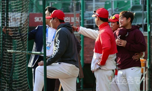 경기 전 키움 이지영이 SK 코치들과 이야기를 나누고 있다.