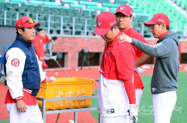 경기 전 SK 염경엽 감독이 최정과 이야기를 나누고 있다.