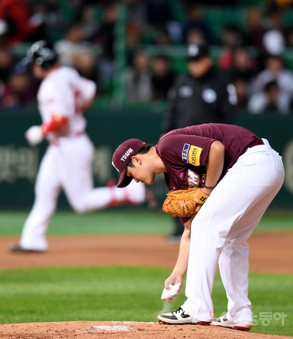 2회말 무사에서 SK 로맥에게 솔로 홈런을 허용한 키움 선발 최원태가 아쉬워하고 있다.