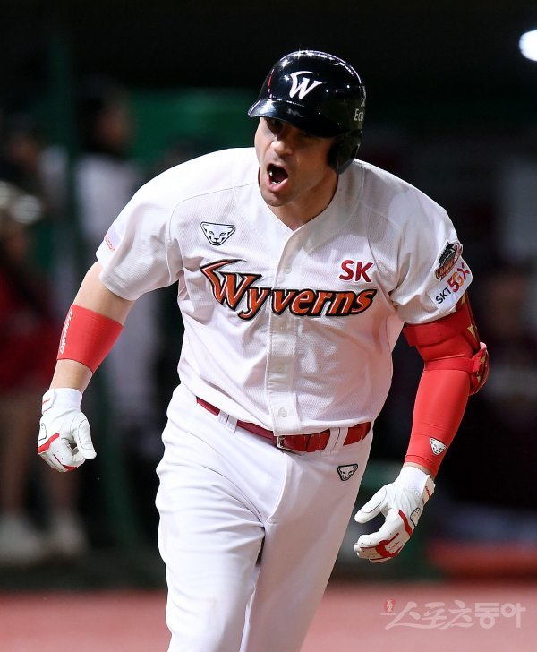 2회말 무사에서 SK 로맥이 좌월 솔로 홈런을 날린 뒤 포효하고 있다.