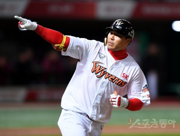3회말 2사 3루에서 SK 한동민이 우월 투런 홈런을 쏘아 올린 뒤 환호하고 있다.
