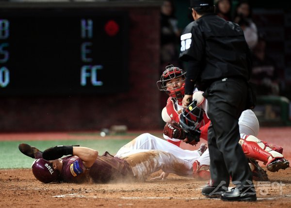 4회초 무사 2루에서 키움 이정후의 안타 때 2루 주자 김하성이 홈으로 파고 들다 SK 이재원에게 태그 아웃되고 있다.