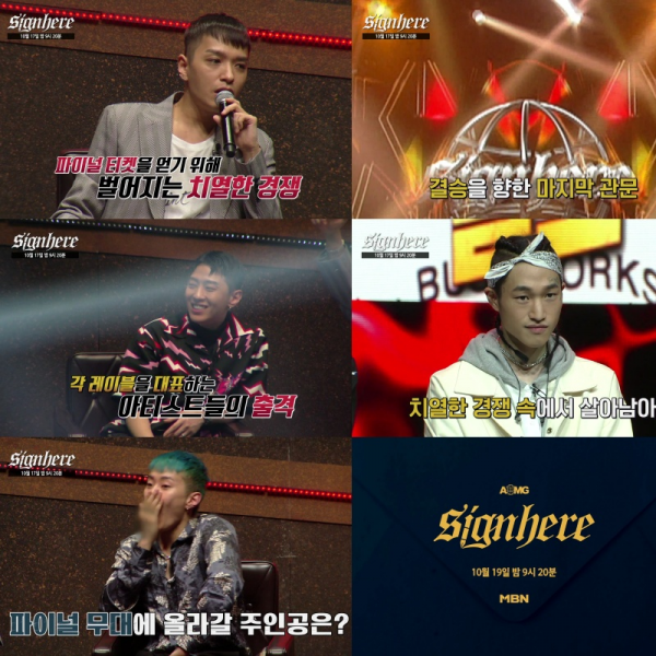 오는 17일 방송되는 MBN ‘사인히어’에서는 5라운드 진출자들이 결승으로 가는 마지막 관문인 ‘타 레이블과의 라이벌 매치’에 임하는 모습이 공개될 예정이다. 스톤쉽, 소니뮤직, 하이어뮤직 등 내로라 하는 레이블에서 출격한 ‘회사 대표’ 아티스트들이 5라운드 진출자들과 자존심을 건 1대1 대결을 벌인다.