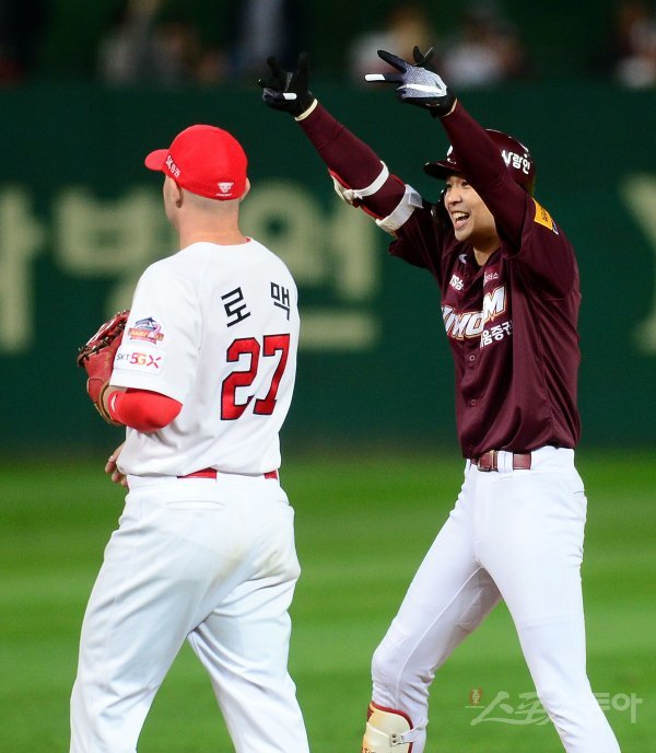 4회초 2사 2,3루 키움 김규민이 동점을 만드는 2타점 2루타를 치고 2루에서 환호하고 있다.