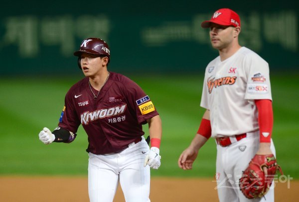 4회초 2사 1,2루 키움 김웅빈이 1타점 적시타를 치고 1루에서 주먹을 쥐고 있다.