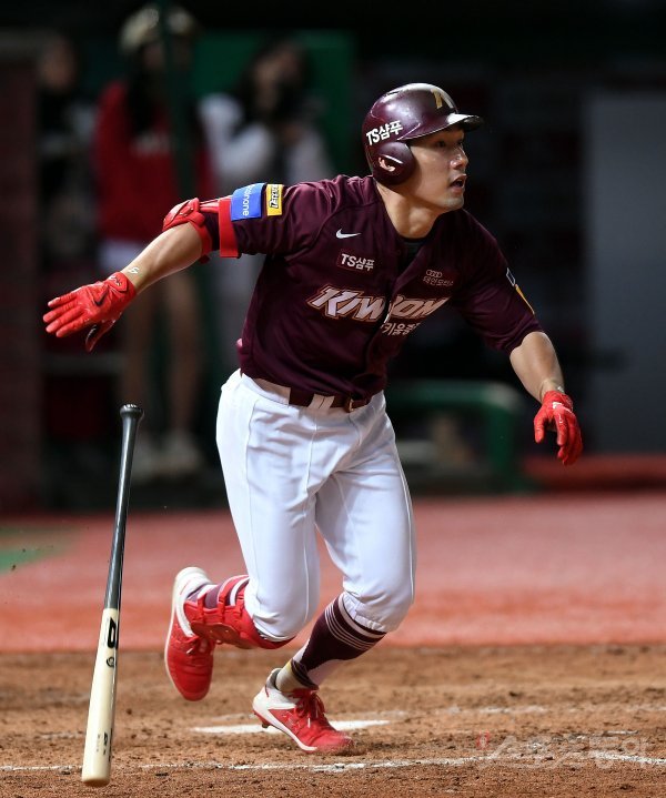 5회초 무사 2루에서 키움 서건창이 1타점 역전 적시타를 날리고 있다.