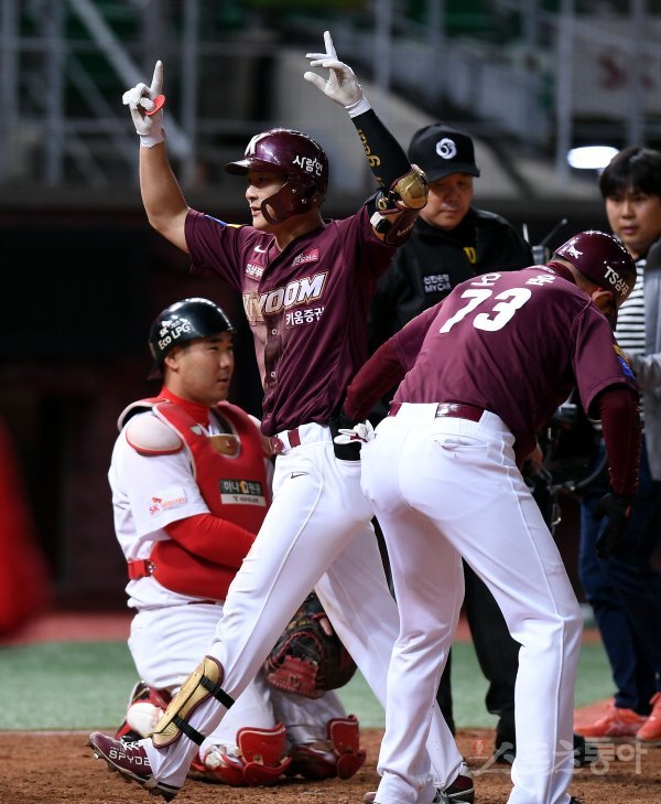 5회초 무사 1루에서 키움 김하성이 좌월 투런 홈런을 쏘아 올린 뒤 환호하고 있다.