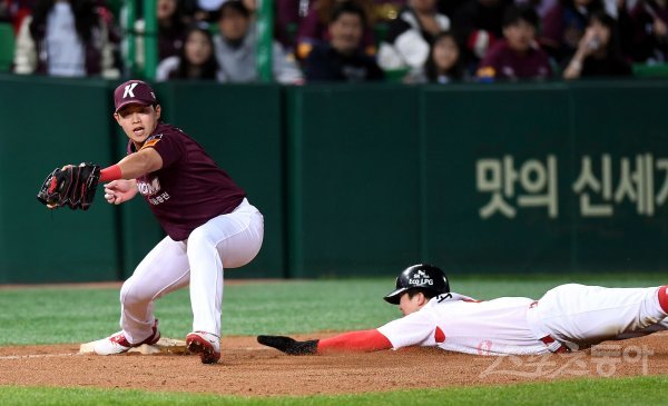 5회말 무사 1, 2루에서 SK 노수광의 희생번트 때 2루 주자 최항이 3루에서 키움 김웅빈에게 포스 아웃되고 있다.