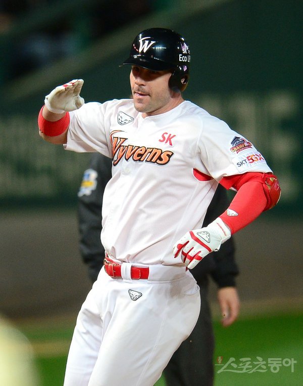 6회말 무사 SK 로맥이 동점을 만드는 우중월 솔로 홈런을 날리고 그라운드를 돌며 기뻐하고 있다.