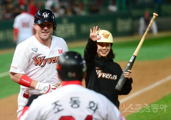 6회말 무사 SK 로맥이 동점을 만드는 우중월 솔로 홈런을 날리고 그라운드를 돌아 홈인해 기뻐하고 있다.