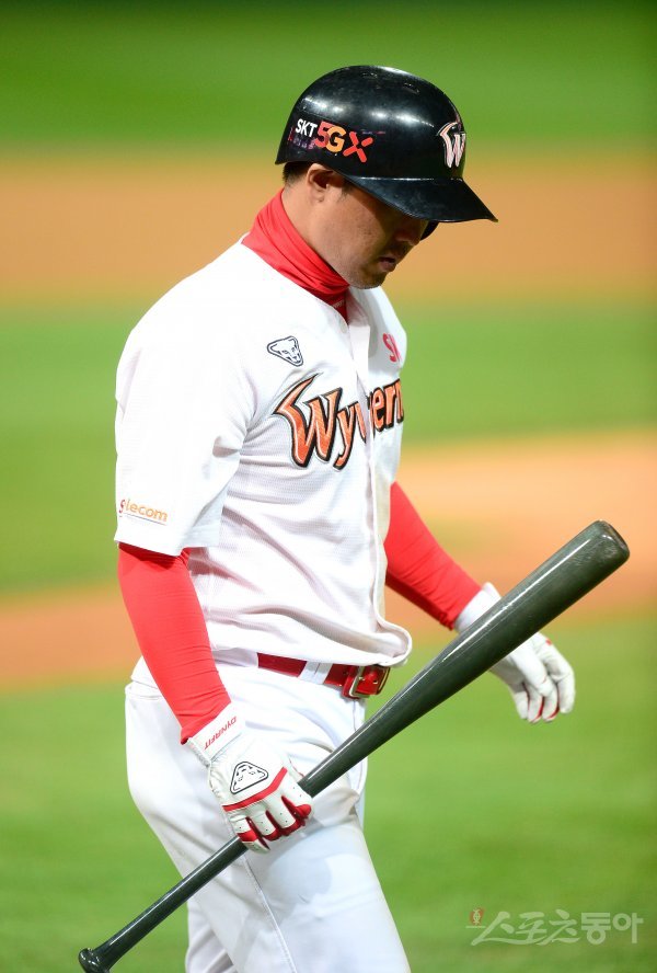 7회말 2사 3루 SK 최정이 삼진 아웃을 당한 후 아쉬워하고 있다.