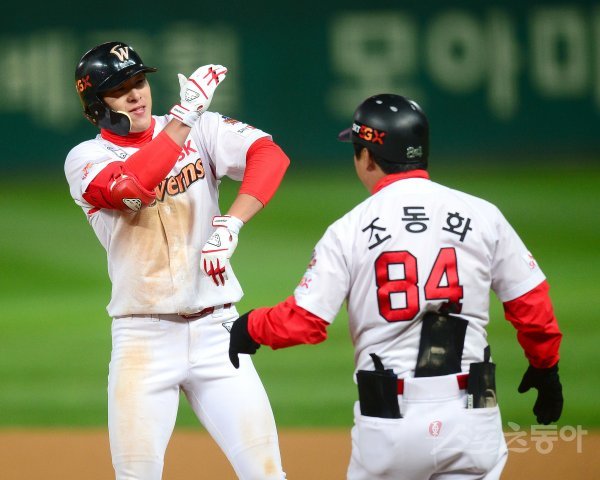 7회말 무사 1루 SK 노수광이 우전 안타를 치고 1루에서 기뻐하고 있다.