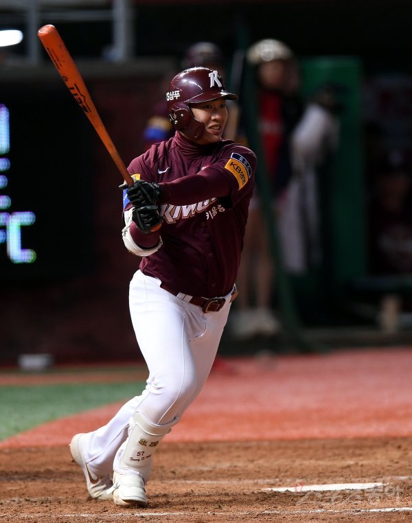 8회초 1사 1, 3루에서 키움 대타 송성문이 역전 1타점 2루타를 날리고 있다.