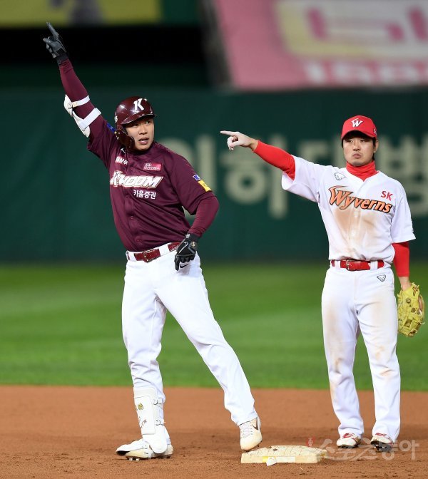 8회초 1사 1, 3루에서 키움 대타 송성문이 역전 1타점 2루타를 날린 뒤 환호하고 있다.
