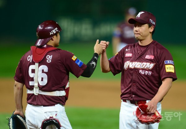 키움 오주원이 8-7 승리를 거둔 후 하이파이브 하고 있다.