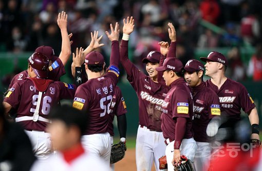 15일 인천 SK행복드림구장에서 ‘2019 신한은행 MY CAR KBO리그’ SK 와이번스와 키움 히어로즈의 플레이오프 2차전 경기가 열렸다. 키움이 SK에 8-7로 승리한 뒤 선수들이 그라운드에서 기쁨을 나누고 있다. 인천|김민성 기자 marineboy@donga.com