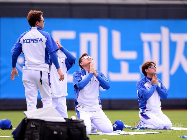 2019 WBSC 프리미어12 출전하는 야구 국가대표팀이 16일 수원 KT위즈파크에서 훈련을 가졌다. 원종현과 김상수(오른쪽)가 스트레칭으로 몸을 풀고 있다.