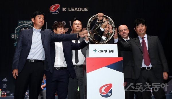 FC 서울 최용수 감독과 포항 스틸러스 김기동 감독, 울산 현대 김도훈 감독, 전북 현대 모라이스 감독, 대구 FC 안드레 감독, 강원 FC 김병수 감독(왼쪽부터)이 트로피를 앞에 두고 포즈를 취하고 있다.