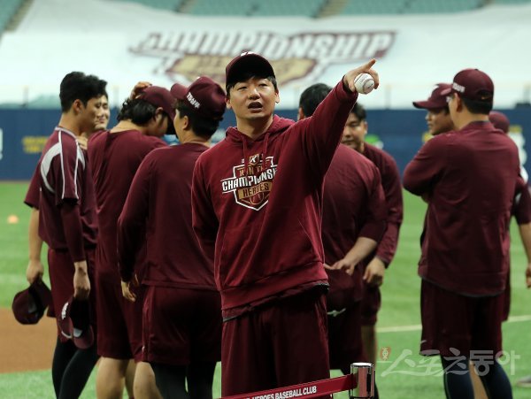 17일 서울 고척스카이돔에서 ‘2019 신한은행 MY CAR KBO 포스트시즌’ 플레이오프 3차전 SK 와이번스와 키움 히어로즈의 경기가 열린다. 키움 오주원이 경기 전 선수들과 대화를 나누고 있다.