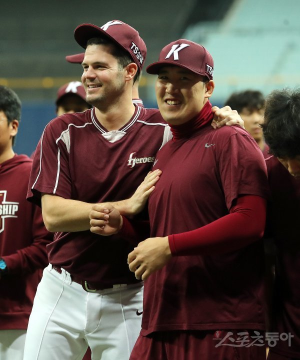 17일 서울 고척스카이돔에서 ‘2019 신한은행 MY CAR KBO 포스트시즌’ 플레이오프 3차전 SK 와이번스와 키움 히어로즈의 경기가 열린다. 키움 브리검과 장영석(오른쪽)이 환하게 웃으며 대화를 나누고 있다.
