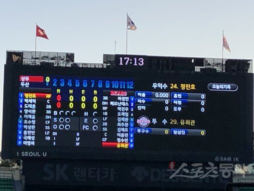 17일 잠실구장에서 열린 상무-두산 연습경기 라인업. 잠실|강산 기자 posterboy@donga.com