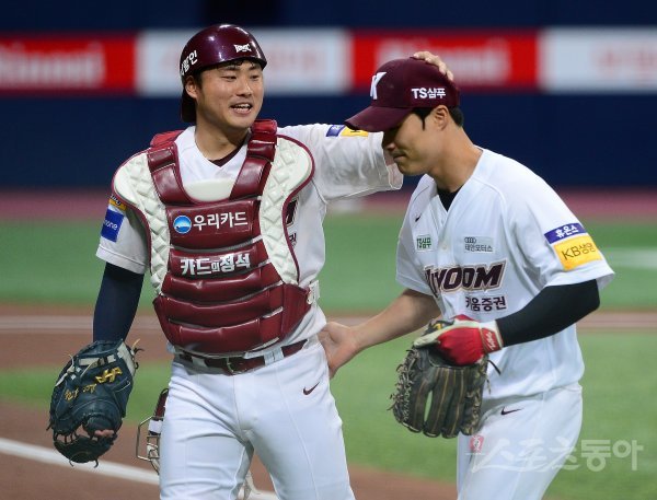 키움 포수 이지영이 1회초 이닝을 마친 후 유격수 김하성(오른쪽)과 기쁨을 나누고 있다.