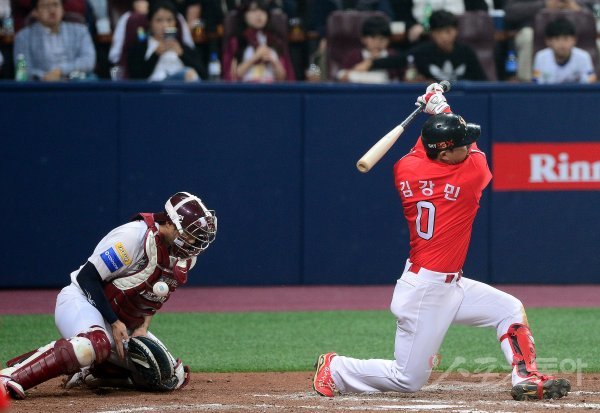 SK 김강민이 3회초 2사 2,3루에서 헛스윙 삼진을 당하고 있다.