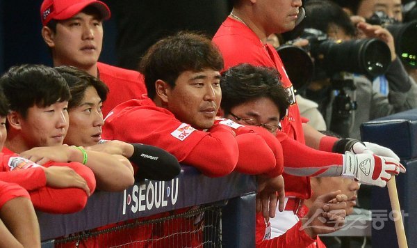 선발 출장에서 제외된 SK 한동민이 더그아웃에서 경기를 바라보고 있다.
