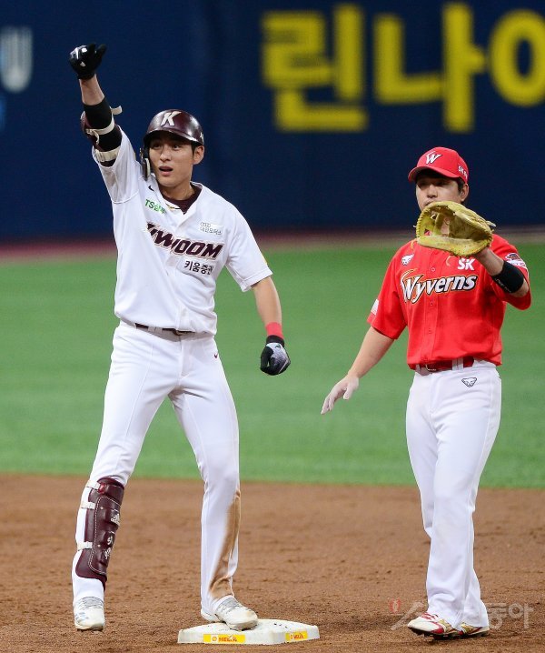 키움 이정후가 3회말 2사 1,2루에서 2타점 2루타를 친 후 덕아웃을 향해 세리머니를 하고 있다.