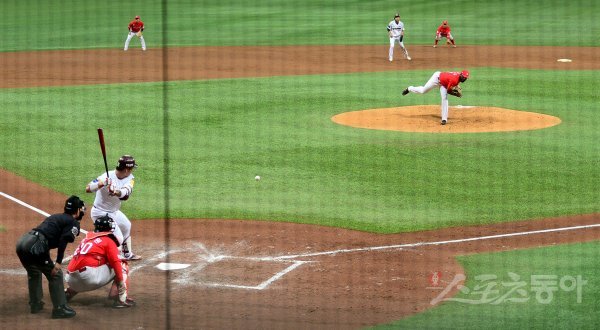 키움 박병호 타석 때 SK 2루수 정현이 2루 베이스 왼쪽에서 수비를 하고 있다.