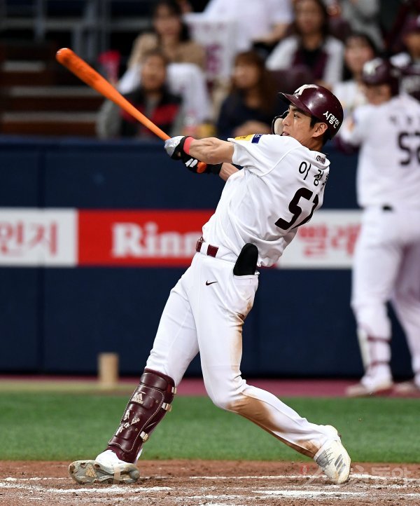 3회말 2사 1, 2루에서 키움 이정후가 2타점 2루타를 날리고 있다.