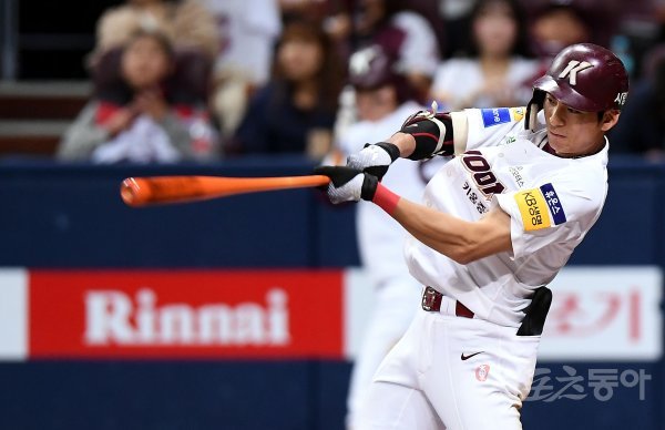 5회말 1사 1루에서 키움 이정후가 안타를 날리고 있다.