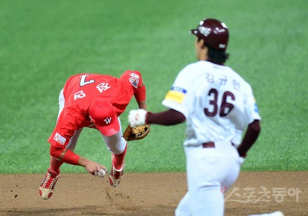 5회말 2사 1루 SK 정현이 내야 땅볼 타구를 실책하고 있다.