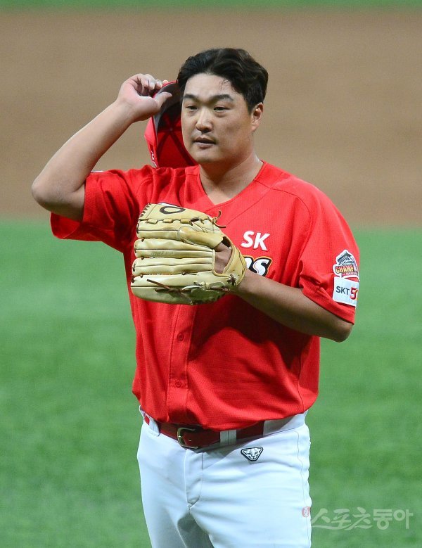 5회말 1사 만루 상황에서 SK 정영일이 밀어내기 볼넷을 허용한 후 아쉬워하고 있다.