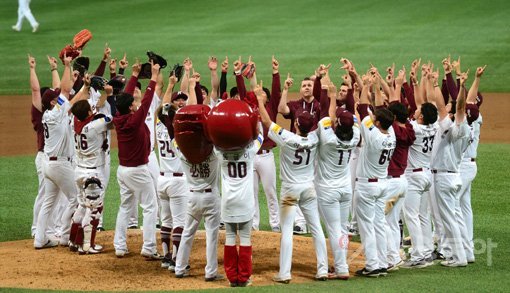17일 서울 고척스카이돔에서 ‘2019 신한은행 MY CAR KBO 포스트시즌’ SK 와이번스와 키움 히어로즈의 플레이오프 3차전이 열렸다. 10-1 승리를 거두며 플레이오프 전적 3승으로 한국시리즈 진출을 확정 지은 키움 선수들이 기뻐하고 있다. 고척|김종원 기자 won@donga.com