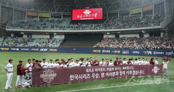경기 후 키움 선수들이 축하 현수막을 앞에 두고 포즈를 취하고 있다.