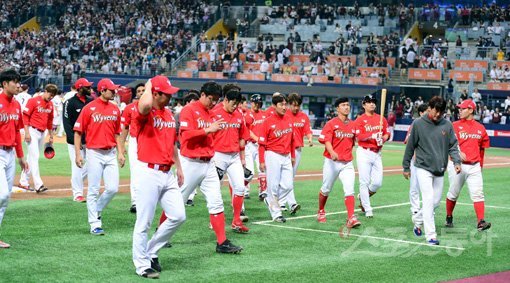 17일 서울 고척스카이돔에서 ‘2019 신한은행 MY CAR KBO리그‘ 키움 히어로즈와 SK 와이번스의 플레이오프 3차전 경기가 열렸다. 키움에 1-10으로 패하며 한국시리즈 진출에 실패한 SK 선수들이 그라운드를 떠나고 있다. 고척|김민성 기자 marineboy@donga.com