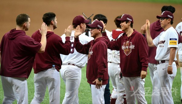 10-1 승리를 거두며 플레이오프 전적 3승으로 한국시리즈 진출을 확정지은 키움 장정석 감독이 선수들과 하이파이브 하고 있다.