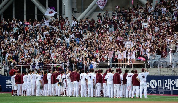키움이 SK에 10-1로 승리하며 시리즈 3승으로 한국시리즈에 진출한 뒤 선수들이 팬들에게 인사하고 있다.