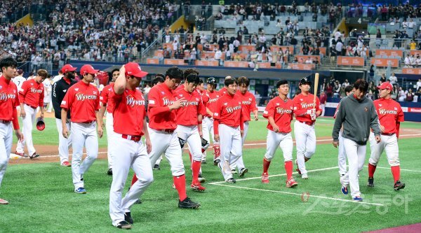 키움에 1-10으로 패하며 한국시리즈 진출에 실패한 SK 선수들이 그라운드를 떠나고 있다.