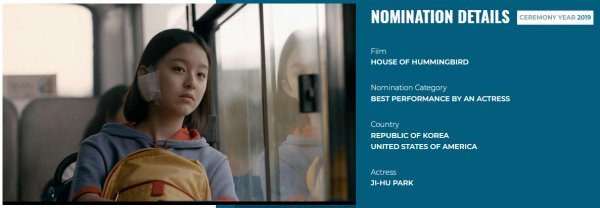 한편, 제13회 아시아 태평양 스크린 어워드에서는 박지후 배우의 여우주연상 후보 노미네이트를 발표하며 기쁜 소식을 더했다. 박지후 배우는 1990년대 초 산업화가 급하게 진행되었던 서울에서 자신의 자리를 찾아가려고 하는 ‘은희’의 복잡한 내면을 섬세한 연기로 완벽하게 소화해내며 첫 장편 데뷔작인 ‘벌새’로 많은 주목을 받았다. 이번 여우주연상 후보 노미네이트 소식은 제18회 트라이베카 영화제에서 최우수 여우주연상을 수상한 데 이어 또 한 번 수상의 영광을 얻을 수 있을지 귀추가 주목되고 있다.