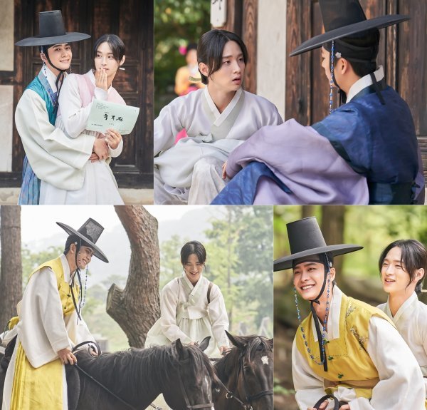 그런 가운데 공개된 사진 속 장동윤과 강태오의 뜻밖의 브로맨스가 설렘을 유발한다. 강태오의 달달한 백허그에 수줍은 듯 입을 가린 장동윤의 능청스러운 표정이 훈훈한 미소를 자아낸다. 극 중에서는 각각 동주의 새어머니와 옛 정혼자로 미묘한 기싸움을 벌이는 녹두와 율무지만, 카메라 밖에서는 서로의 껌딱지를 자처하는 특급 케미를 발산한다. 눈만 마주쳐도 웃음을 주고받는 두 사람의 화기애애한 모습이 심장을 두근거리게 만든다.
