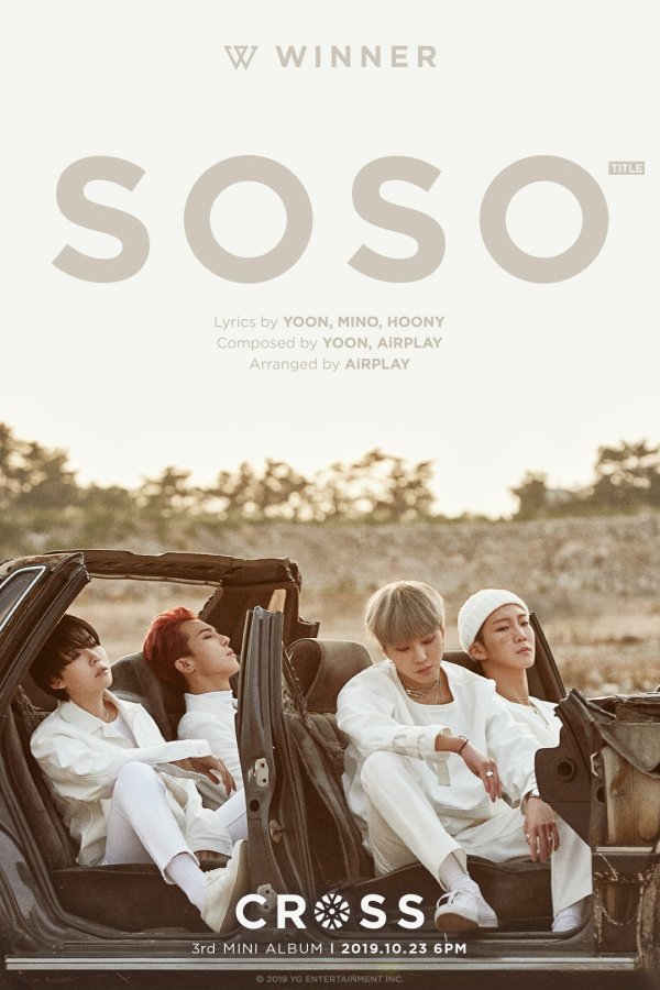 ‘SOSO’라는 타이틀이 크게 자리한 포스터 하단에는 화이트 캐주얼 수트를 입은 네 멤버가 파손된 차 안에 앉아 있다. 위너 멤버들은 눈을 감거나 어딘가를 응시하며 황량한 분위기를 자아냈다.