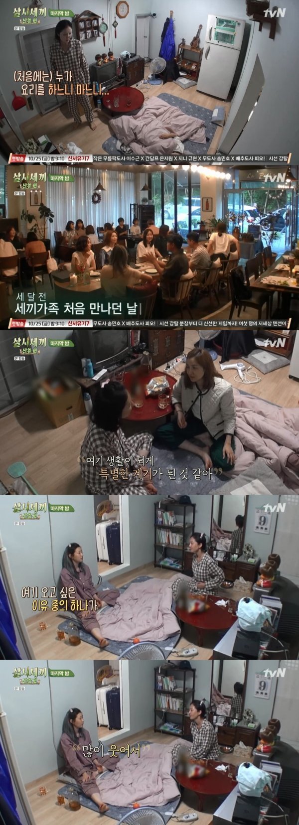 18일 오후 방송된 tvN 예능프로그램 ‘삼시세끼 산촌편’(이하 ‘삼시세끼’)에서는 염정아, 윤세아, 박소담이 마지막 날 밤 소감을 말하는 장면이 그려졌다.